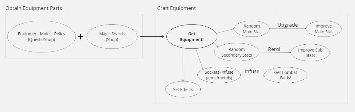 1. Craft Equipment with Equipment Mold + Relics + Magic Shards. Crafted equipment will randomly roll their main and secondary stats.