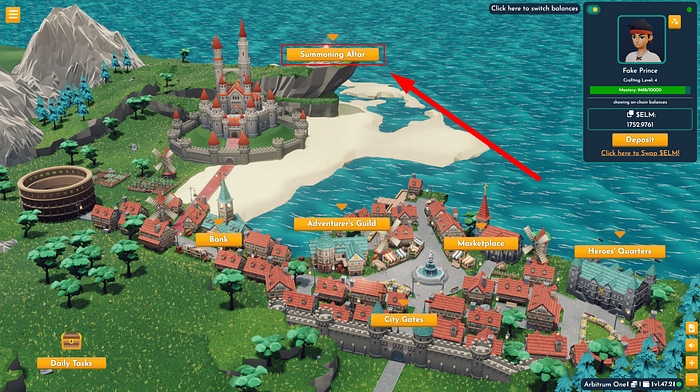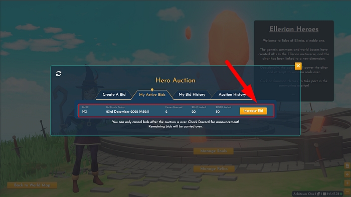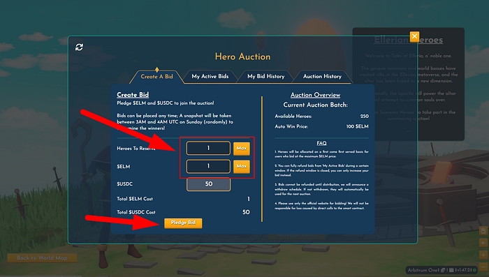 4. Click on Summon Heroes. In the UI that appears, you can choose the number of heroes to bid for, and the amount of $ELM you are willing to pay per hero.