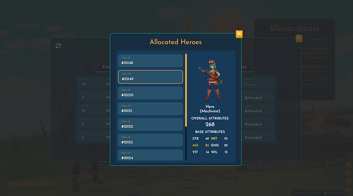 Minting costs 50 $USDC and a flexible amount of 0–100 $ELLERIUM. Heroes will be distributed weekly on Sundays to the top 250 bids, prioritizing $ELM bid price.