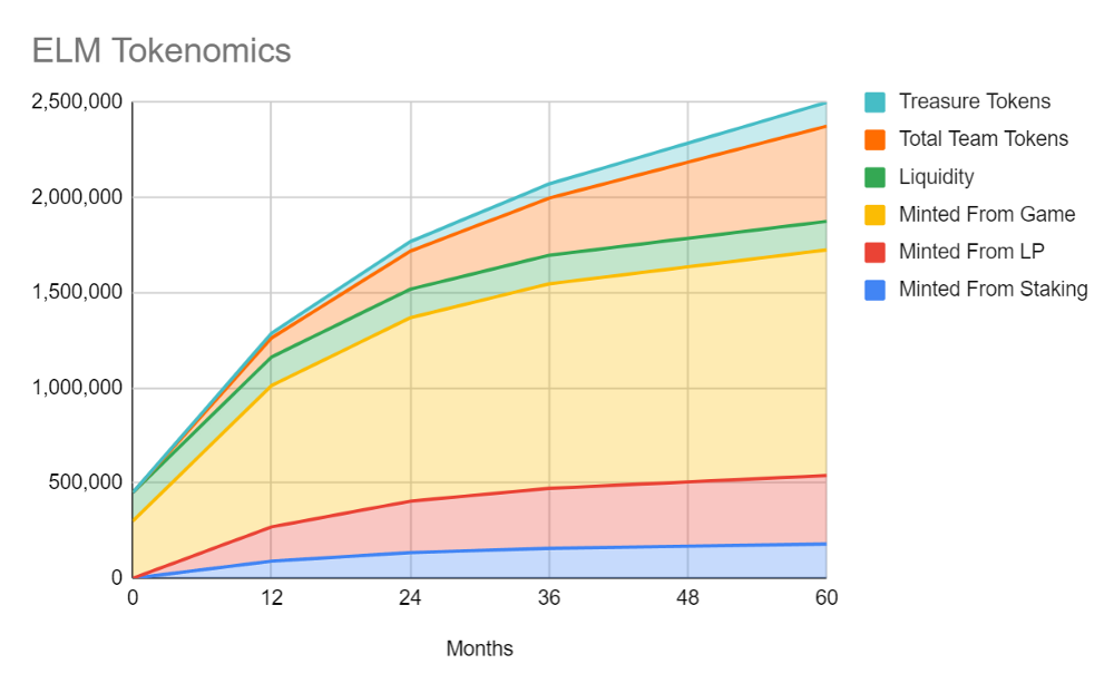 <table data-header-hidden><thead><tr><th width="214.33333333333331">Holder</th><th width="150">ELM (%)</th><th width="150">ELM ($)</th><th>Vesting</th></tr></thead><tbody><tr><td></td><td>ELM (%)</td><td>ELM ($)</td><td>Vesting</td></tr><tr><td>Ecosystem</td><td>69%</td><td>1,725,000</td><td>Vested as game progresses</td></tr><tr><td>TreasureDAO (Seed)</td><td>5%</td><td>125,000</td><td>6 month cliff; vested linearly over 5 years</td></tr><tr><td>Team</td><td>20%</td><td>500,000</td><td>9 month cliff; vested linearly over 5 years</td></tr><tr><td>Liquidity</td><td>6%</td><td>150,000</td><td>N/A</td></tr></tbody></table>